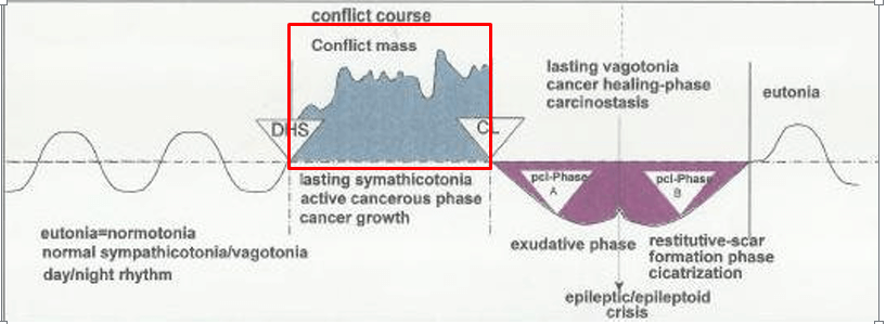 - Duygusal Çatışma: Her hastalık, beklenmedik, şiddetli ve izole edici bir travma sendromu (DHS) sonucu ortaya çıkar. Bu şok aynı anda psişe, beyinde ve ilgili organda başlar.
